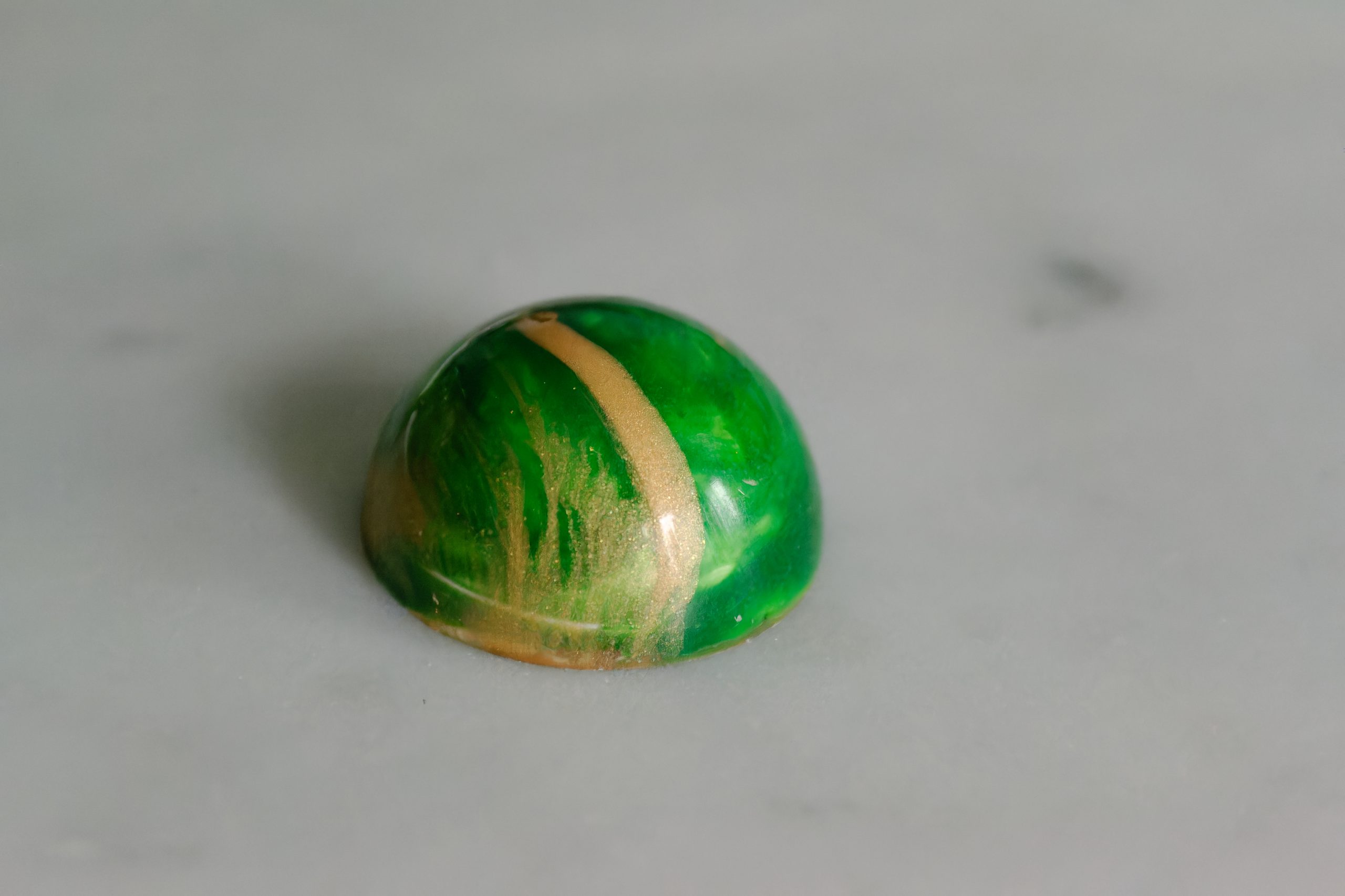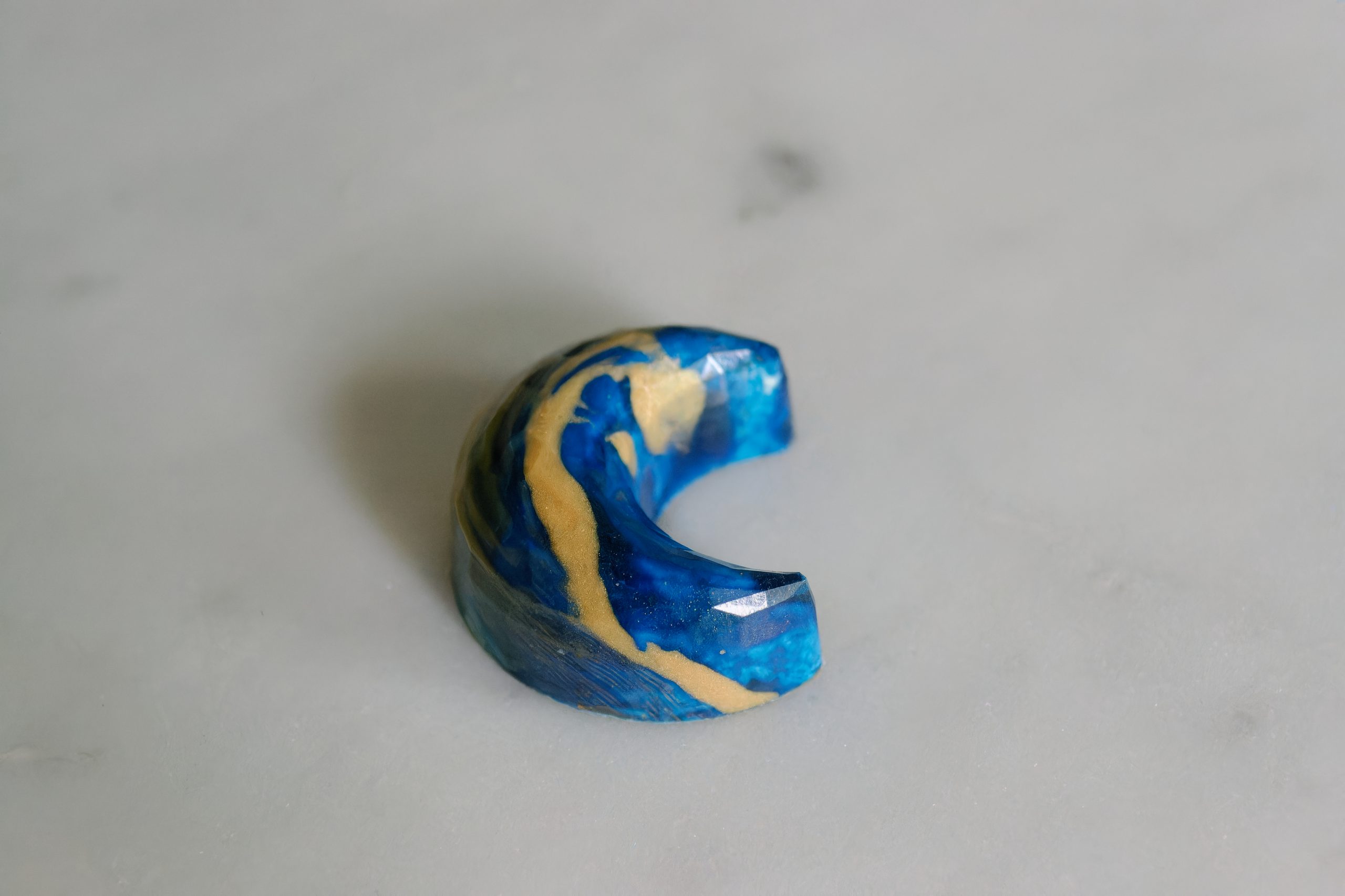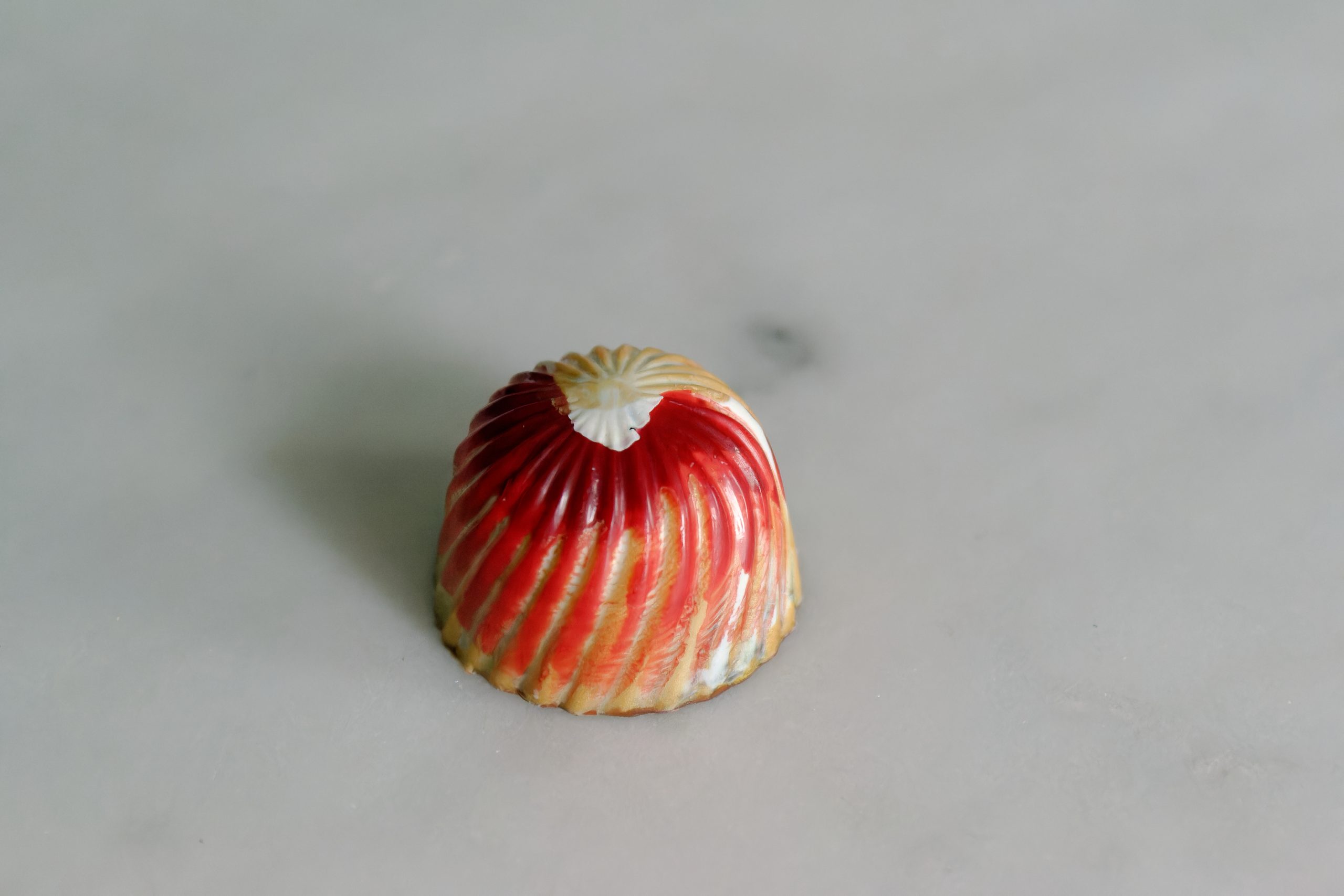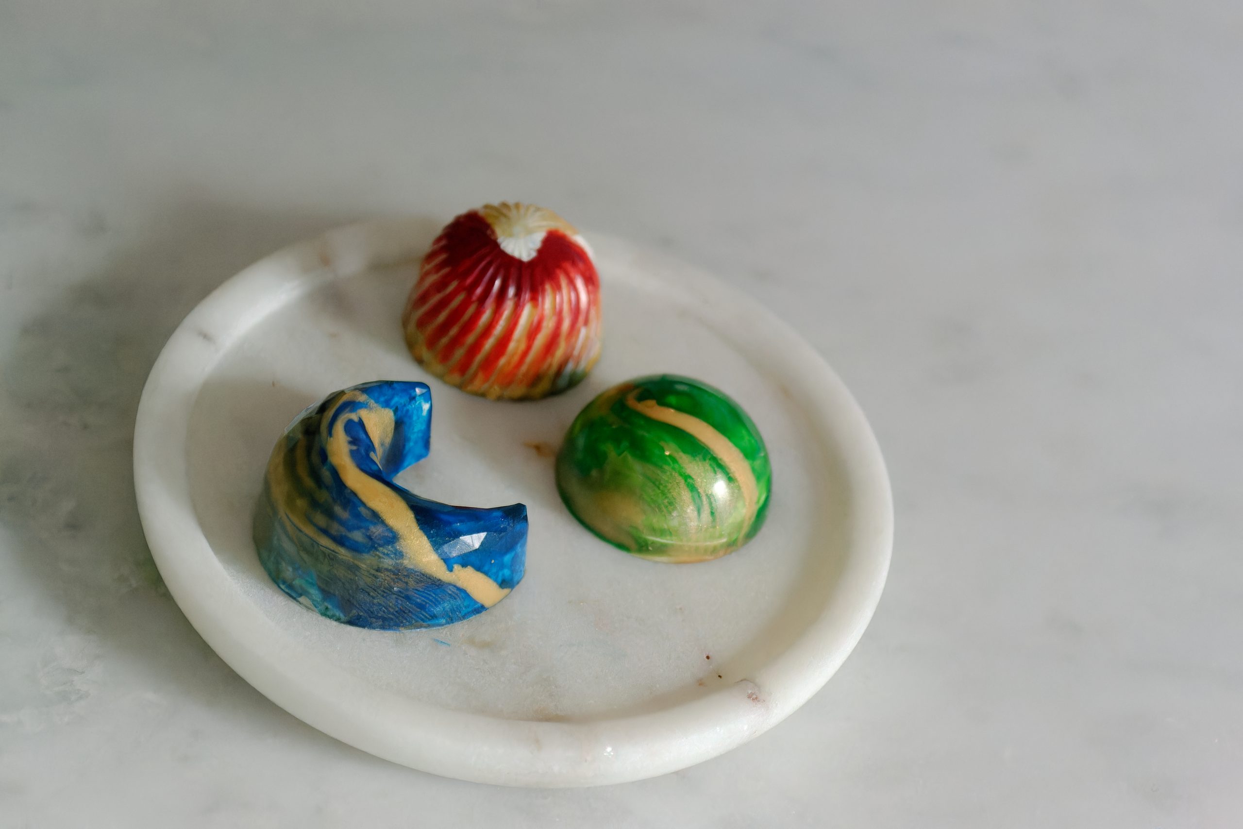 Intricately hand-crafted milk chocolate pralines with a variety of fillings. Each box contains an assortment of shimmering gold and blue crescent moons with a date-infused ganache filling, green and gold domes with a creamy caramel filling, and fiery red and gold spirals with a hazelnut ganache filling.